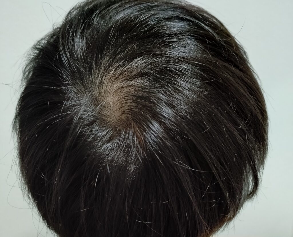 頭頂部の透け感や髪の密度に目立った変化はなし。