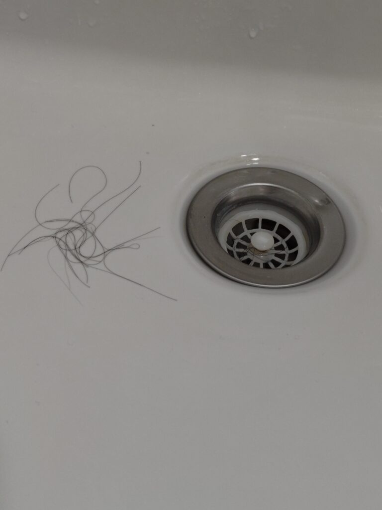 実際の写真にです。 排水溝にある髪がシャンプー時でその隣にまとめてあるのがドライヤー時の抜け毛になります。