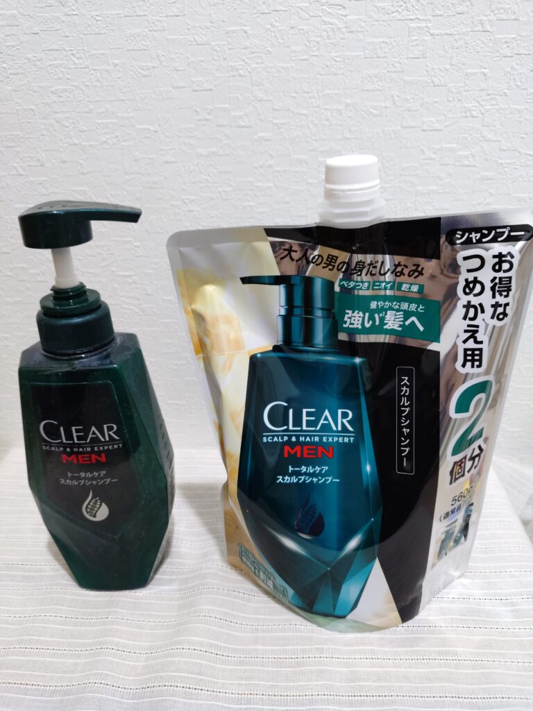 僕が実際に愛用しているCLEAR(クリア)フォーメン。常に「2回分つめかえ用」をストックしているのが、5年継続しているリアルな証拠です(笑)。